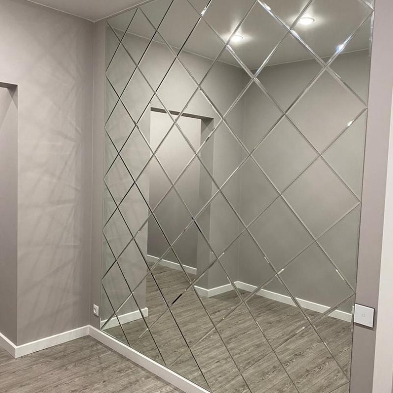 Использована серебристая квадратная зеркальная плитка размером 18х18.
