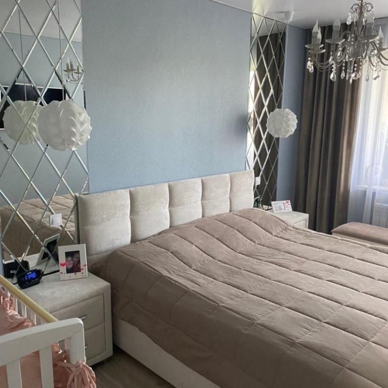 Самый популярный вариант при украшении зеркальной плиткой спальни – это узкие панно рядом с изголовьем. Конечно, это не случайно. Здесь они смотрятся наиболее уместно и не доминируют в интерьере. К тому же обычно по сторонам двуспальной кровати располагаются настенные или настольные светильники, свет которых красиво отражается в зеркальном панно.